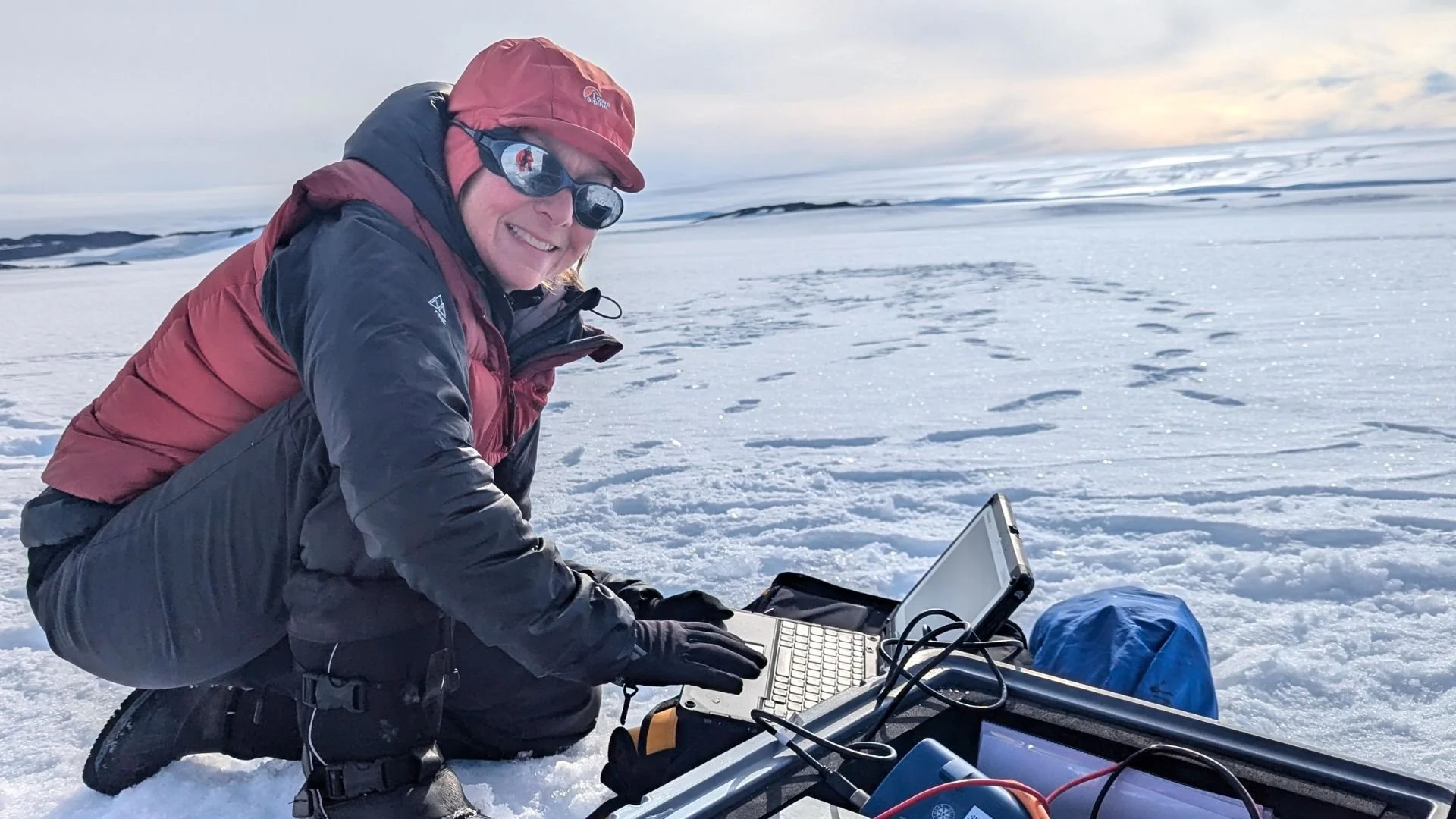 Anya Reading (Field Leader, GRIT Director, Chief Investigator) downloads seismic data from a site near the Browning Penisula, East Antarctica, adjacent to the fast-changing Vanderford Glacier. Image: Arno Payan (Field Guide)